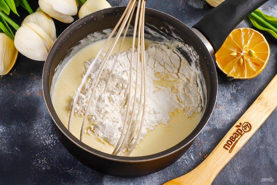 Всыпьте муку и вмешайте ее в сметанную массу. Поместите емкость на плиту, включая умеренный нагрев, и заварите ее в течение 8-10 минут, не забывая помешивать венчиком.