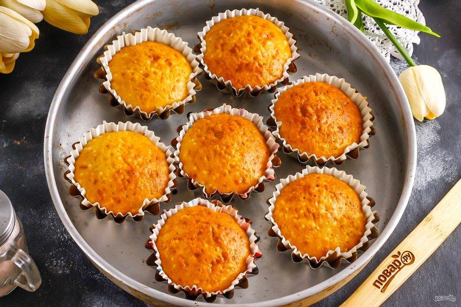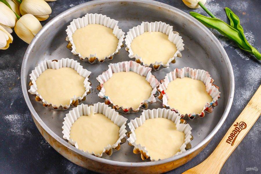 Разогрейте духовку до 180 градусов. В металлические формочки выложите бумажные формочки и влейте тесто в них, чтобы оно заполнило чуть выше середины.