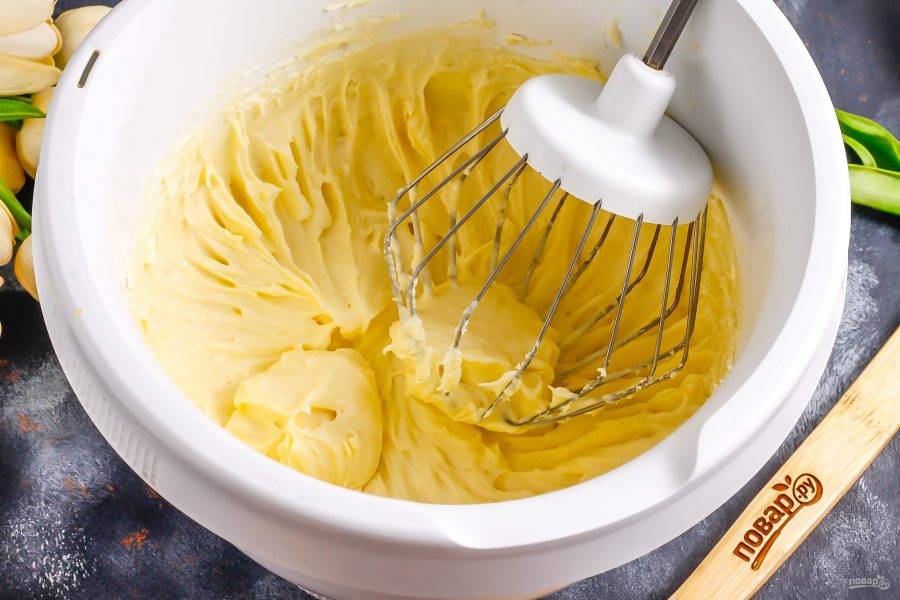 Остывший крем взбейте со сливочным маслом примерно 2-3 минуты.