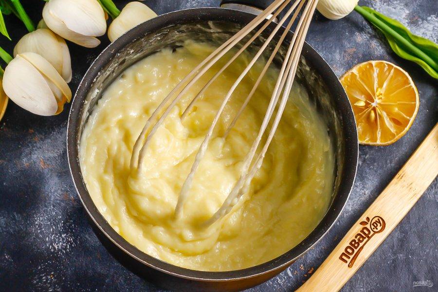 Снимите емкость с кремом с плиты. Затем накройте крем пищевой пленкой, вынесите на холод примерно на 30 минут для остывания.