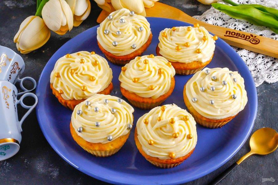По желанию вы можете вырезать серединки кексов, чтобы в них стало больше крема. Поместите крем в кулинарный шприц и отсадите на капкейки кремовые шапочки. Украсьте их посыпкой или кусочками фруктов, ягодами.