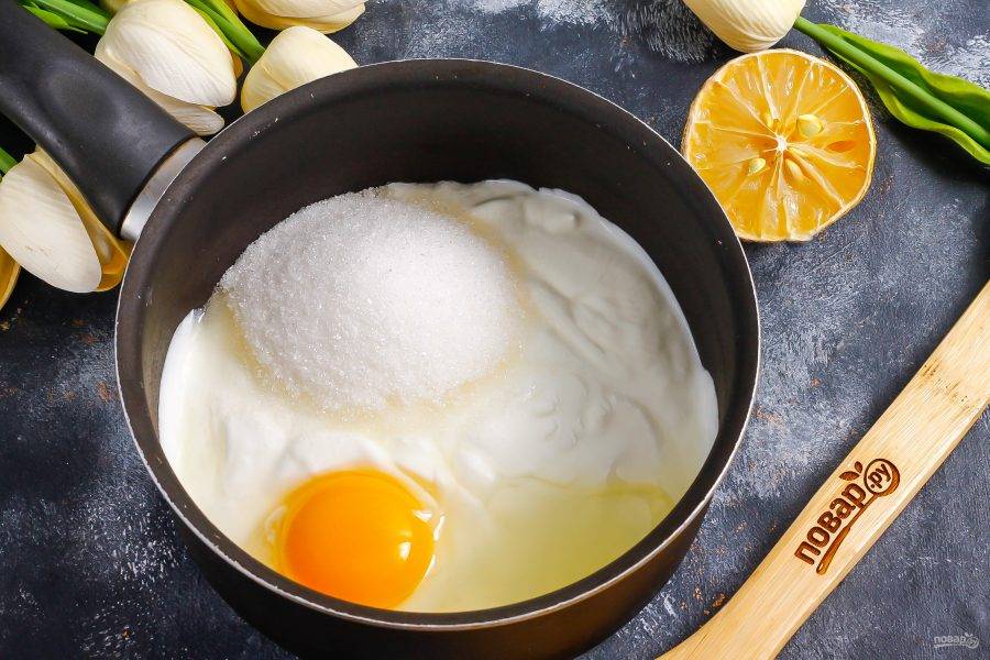 Пока кексы остывают, в емкости с антипригарным дном соедините сметану любой жирности, сахар и лимонный сок. Вбейте туда же куриное яйцо и все тщательно перемешайте.