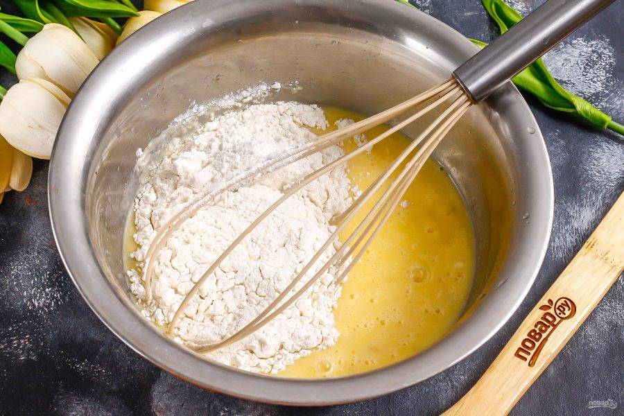Всыпьте пшеничную муку и разрыхлитель. Можно добавить ванильный сахар или ароматизатор. Аккуратно вмешайте их в тесто.