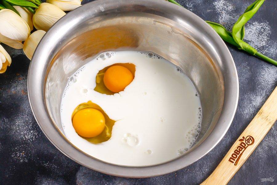 Вбейте в глубокую емкость куриные яйца, влейте молоко любой жирности, всыпьте соль, сахар и взбейте все.