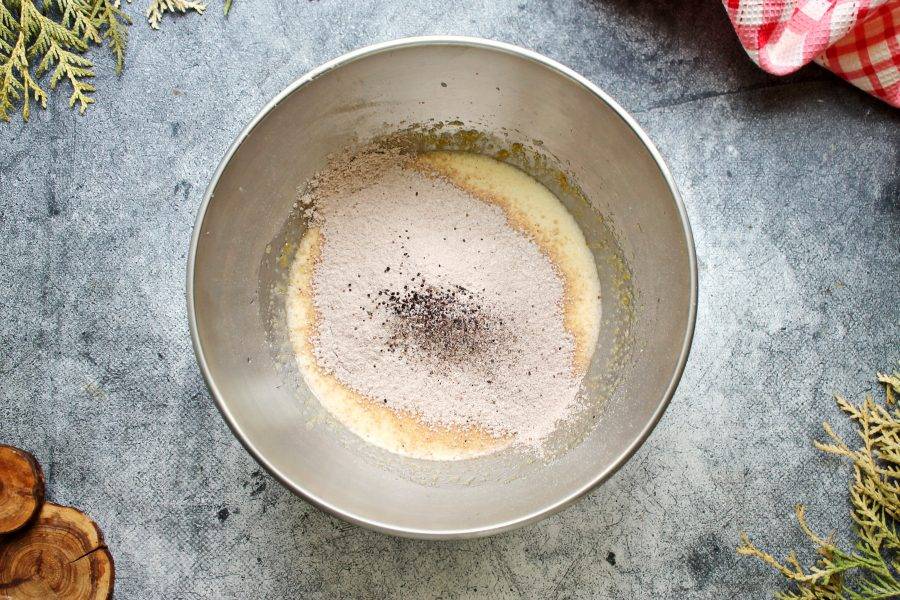 Муку смешайте с какао и разрыхлителем, просейте в миску. Аккуратно перемешайте до однородного теста.
