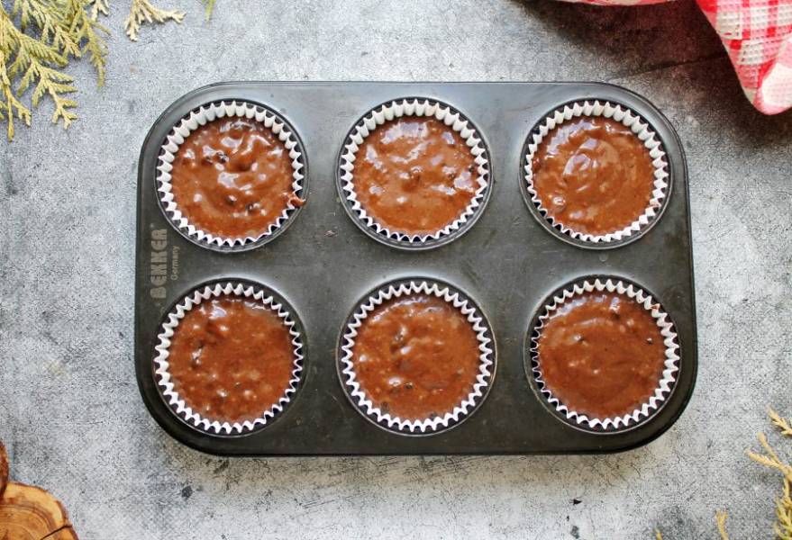 Бумажные формочки установите в форму с круглыми выемками и разложите тесто на 2/3 высоты.