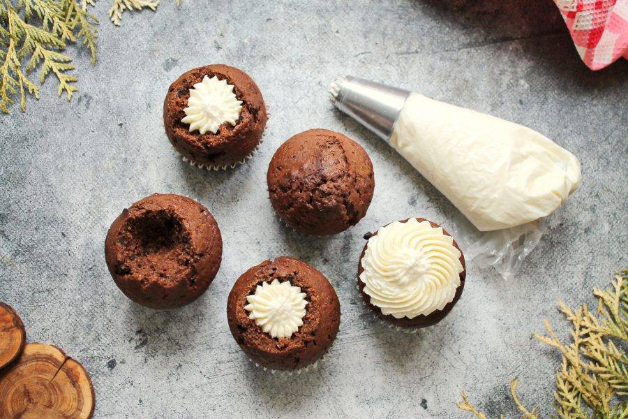 У готовых капкейков вырежьте середину, не доходя до низа. Крем переложите в корнетик с насадкой открытая звезда. Заполните кремом пустоту в капкейке и сделайте шапочку. Украсьте капкейки с печеньем "Орео" по своему усмотрению и подавайте к столу.