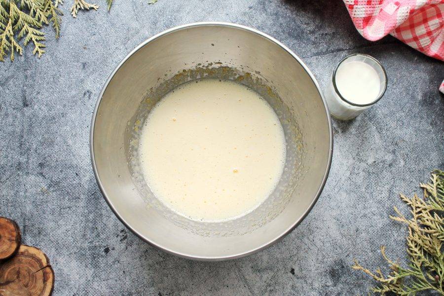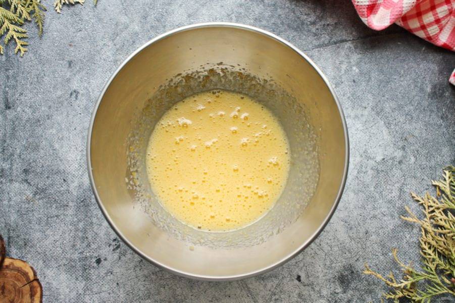 Влейте в яичную массу растительное масло и взбейте на медленной скорости до однородности.