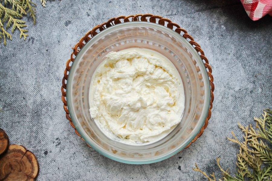 В миску выложите творожный сыр, сахарную пудру, влейте сливки и взбейте в пышный крем.