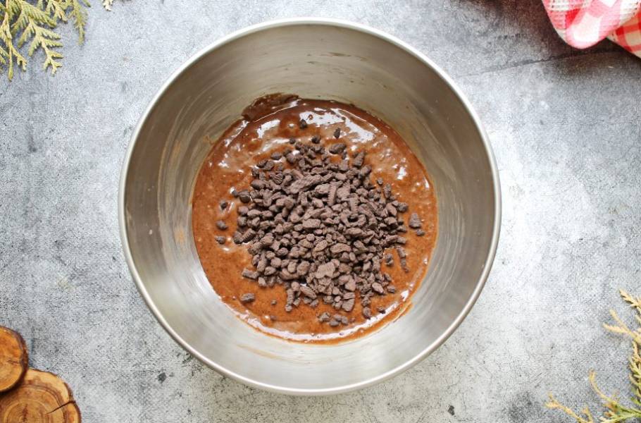 Печенье "Орео" порубите в крупную крошку и добавьте в тесто, перемешайте.