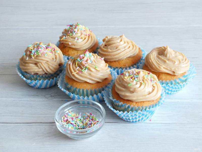 Достаньте крем из холодильника, наполните кондитерский мешок с насадкой звездочка. На подготовленные основы сверху нанесите крем в виде шапочки. Оформите кондитерской посыпкой. Охладите в холодильнике в течение 20-30 минут.