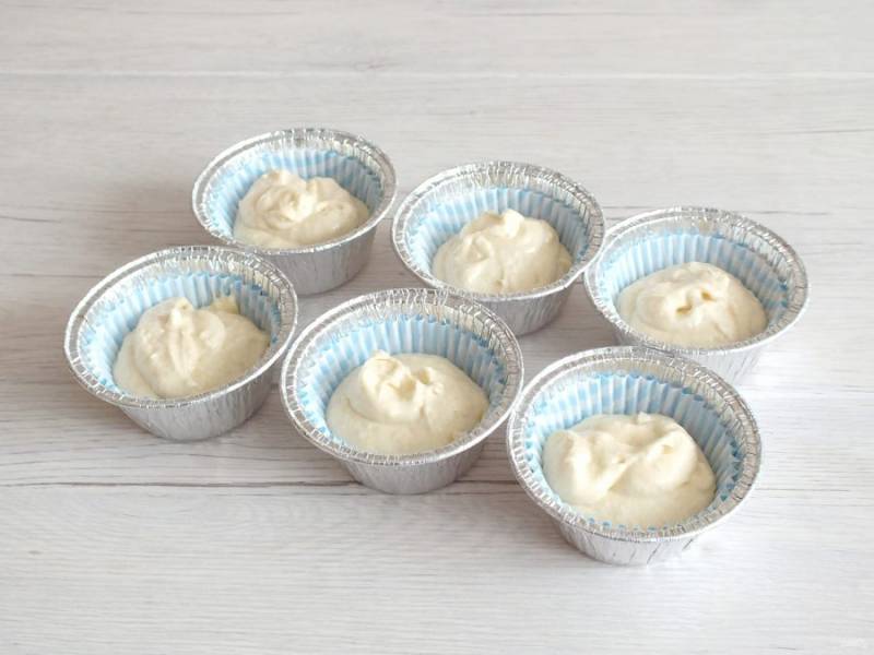 Разложите тесто в бумажные формочки. Заполняя на 2/3 объема. Поставьте выпекаться в разогретую до 170 градусов духовку на 20-25 минут.