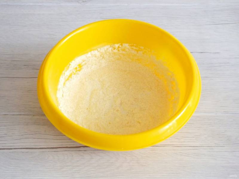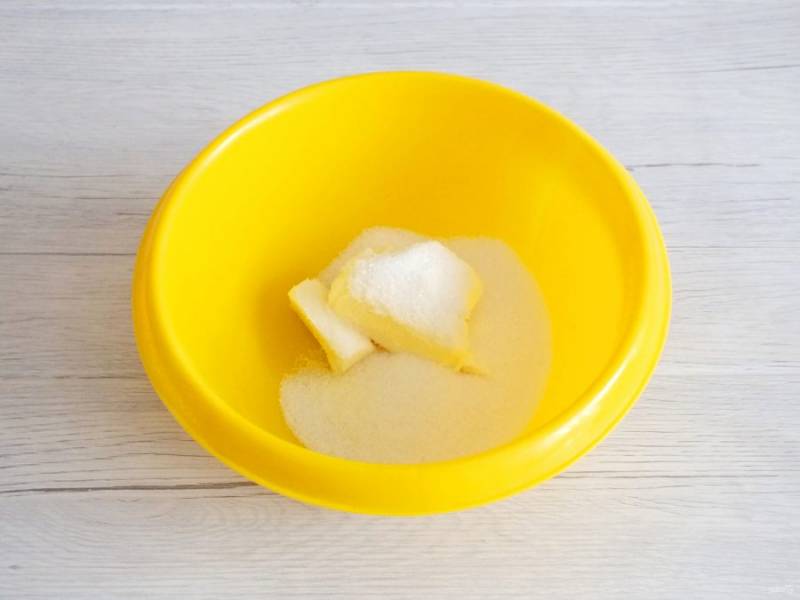 Соедините в чаше мягкое сливочное масло с сахаром. Взбейте в течение 3-4 минут в однородную массу.