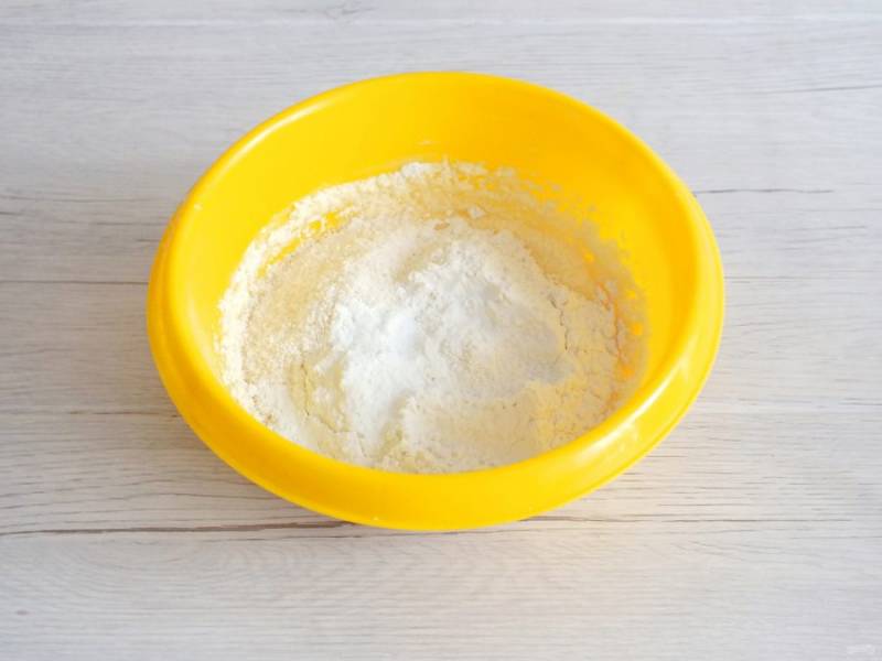 Всыпьте муку, добавьте ванилин, разрыхлитель.