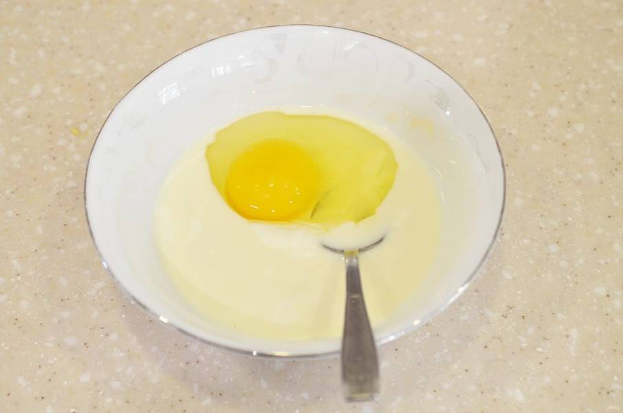 Смешайте сметану, молоко и яйцо. Слегка взбейте.