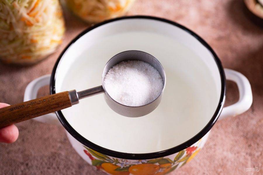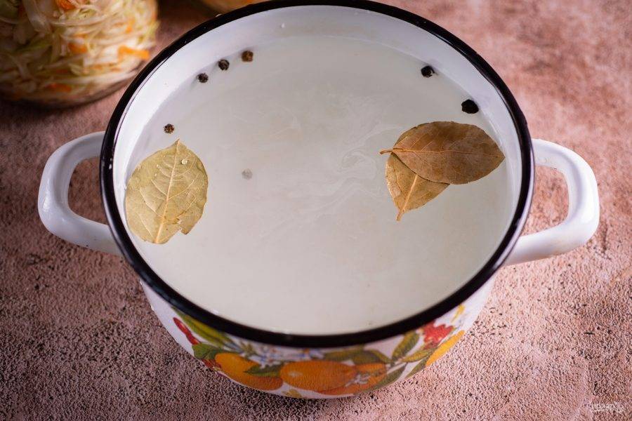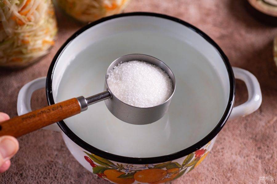 Приготовьте рассол-заливку. В кастрюлю залейте литр воды, добавьте сахар.