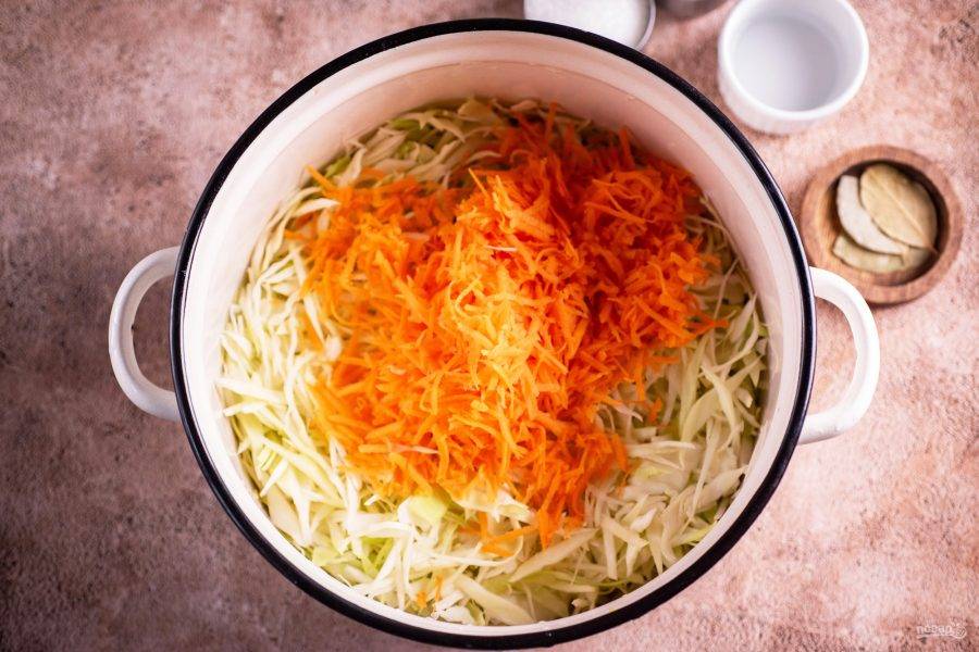 В объемную емкость выложите всю нашинкованную капусту и помните хорошенько ее руками.