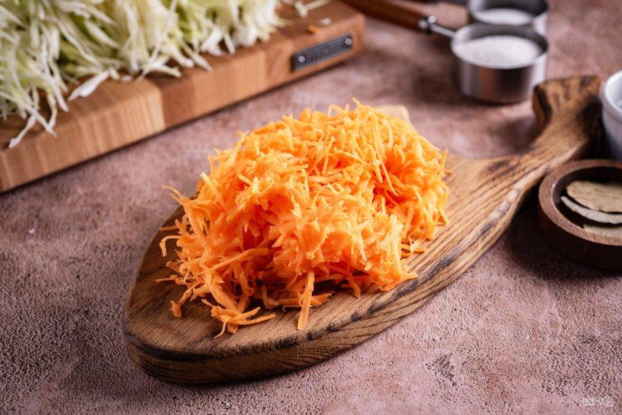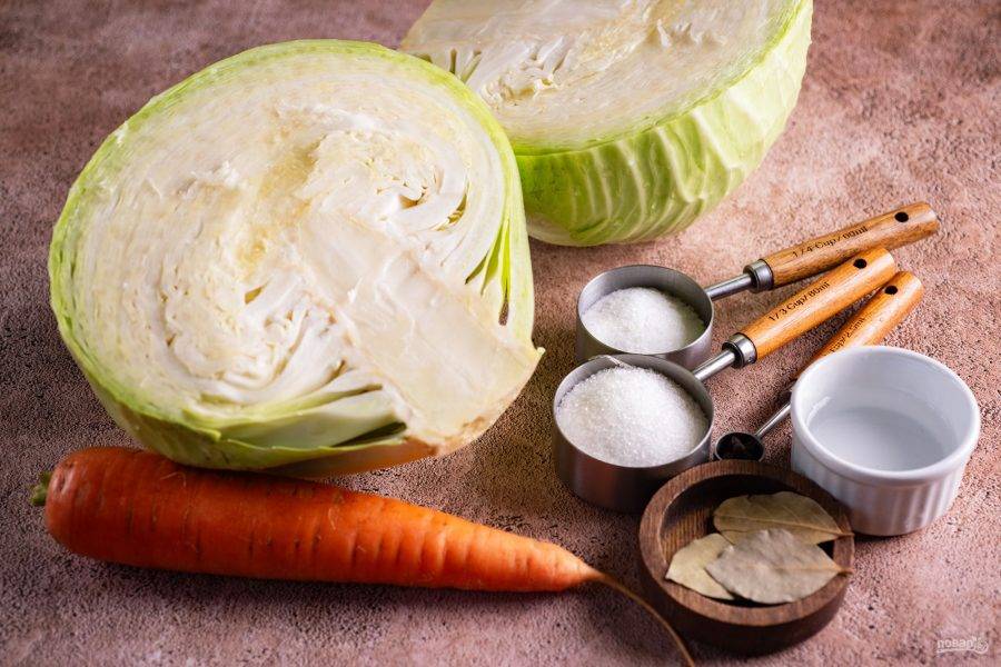 Выложите все необходимые для приготовления продукты на стол. Кочан капусты помойте в прохладной воде, морковь помойте и почистите.