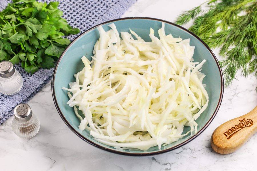 Нашинкуйте часть капусты не слишком тонкими лентами, но и не крупными. Выложите в миску или салатник, а кочерыжку — удалите.