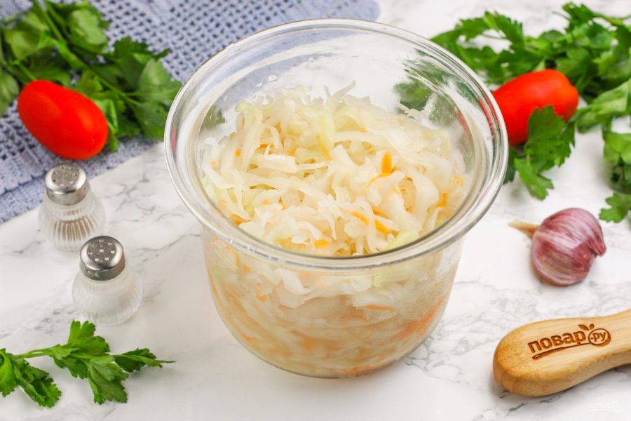 Спустя 3-4 дня капуста будет готова. Ее можно вынести на холод или хранить в подвале, погребе в рассоле в течение 3-4 месяцев.