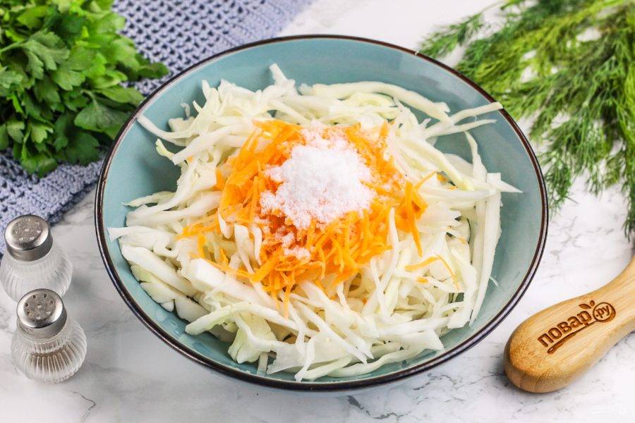 Всыпьте соль и протрите все с небольшим нажимом, чтобы нарезки выделили сок. Но не сильно перетирайте, чтобы не получилась каша!