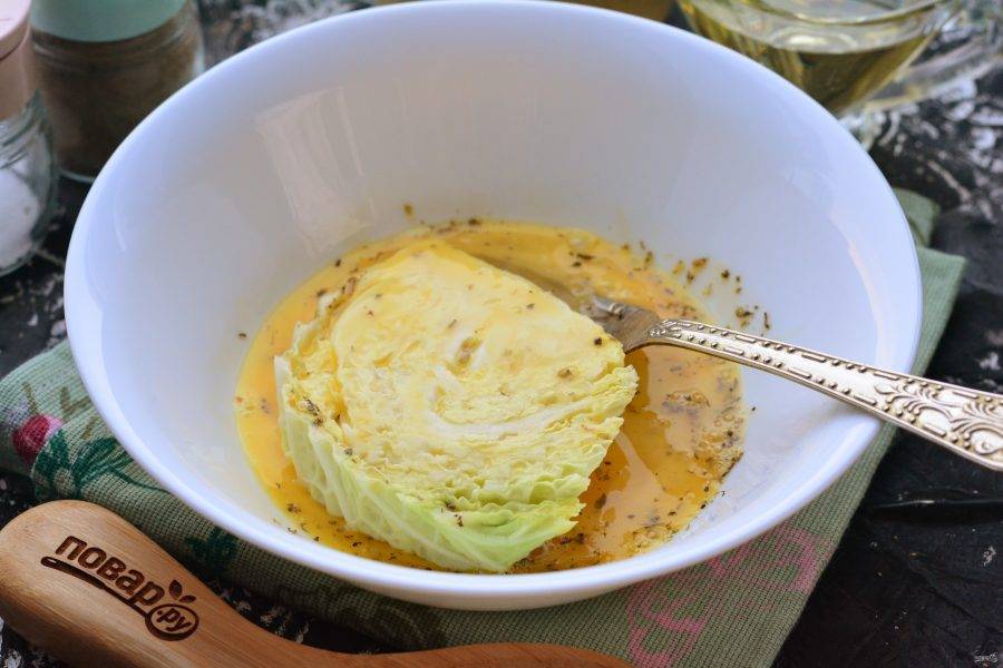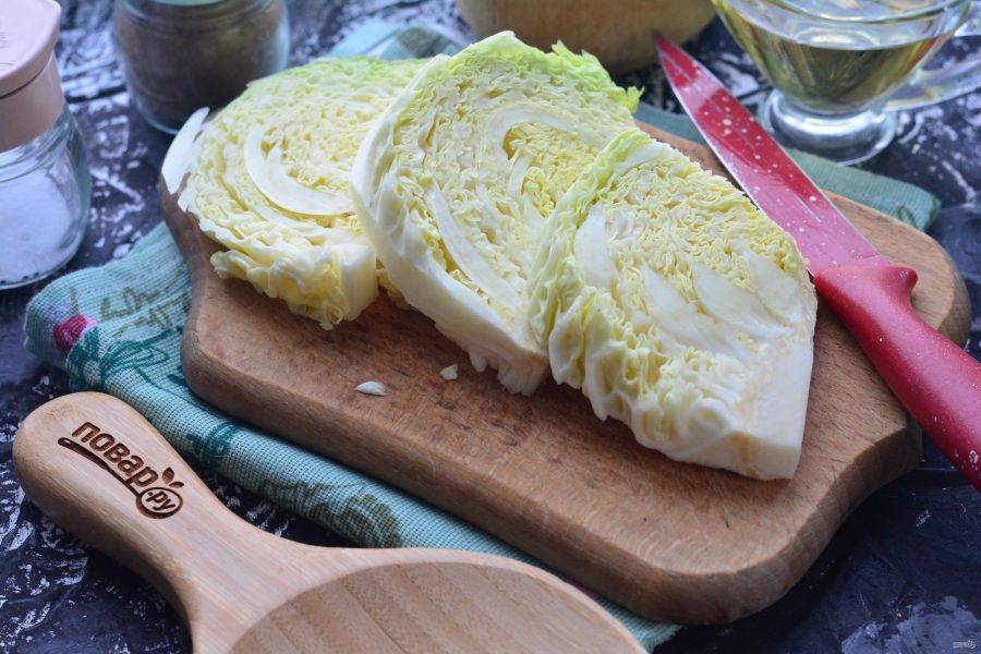 Нарежьте савойскую капусту крупными ломтиками, чтобы на одном конце остался кусочек кочерыжки — он будет скреплять кусочек капусты.