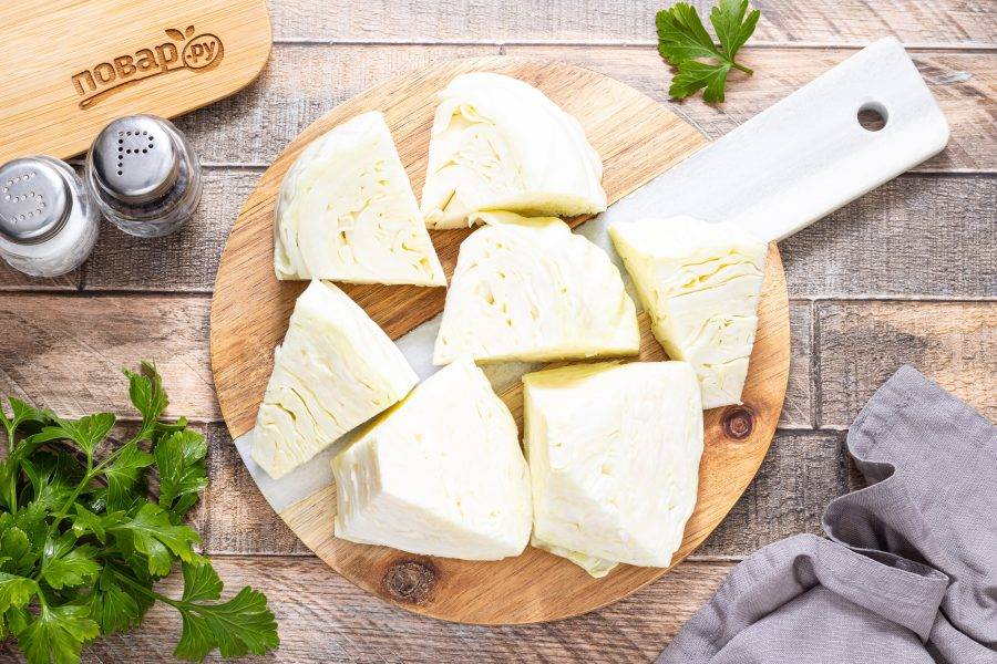 С капусты снимите верхние испорченные листья. Разрежьте на 4 части, удалите кочерыжку. Затем каждую часть нарежьте крупными кусочками. А если используете небольшие банки, то можно порезать капусту на квадратики среднего размера.