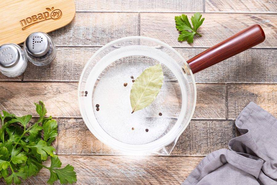 Для маринада вскипятите воду с сахаром, соль, лавровым листом и перцем горошком. Проварите, чтобы сахар и соль полностью растворилась. В конце влейте уксус, снова доведите до кипения и снимите с плиты.