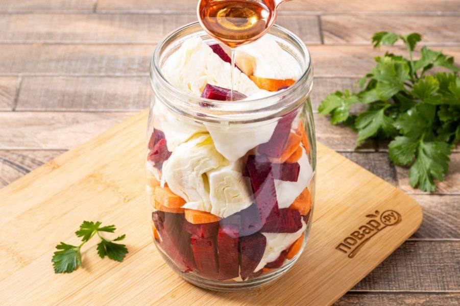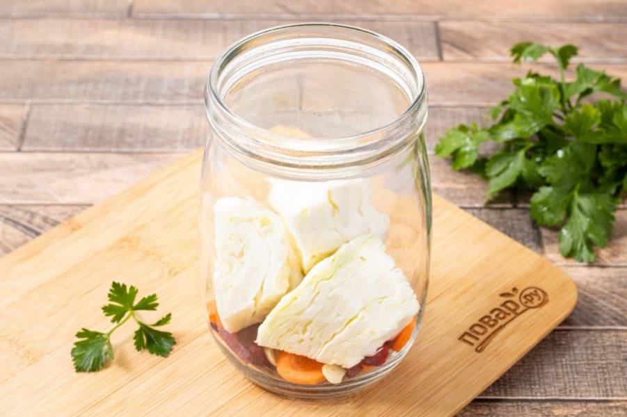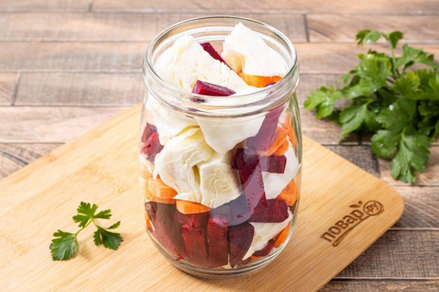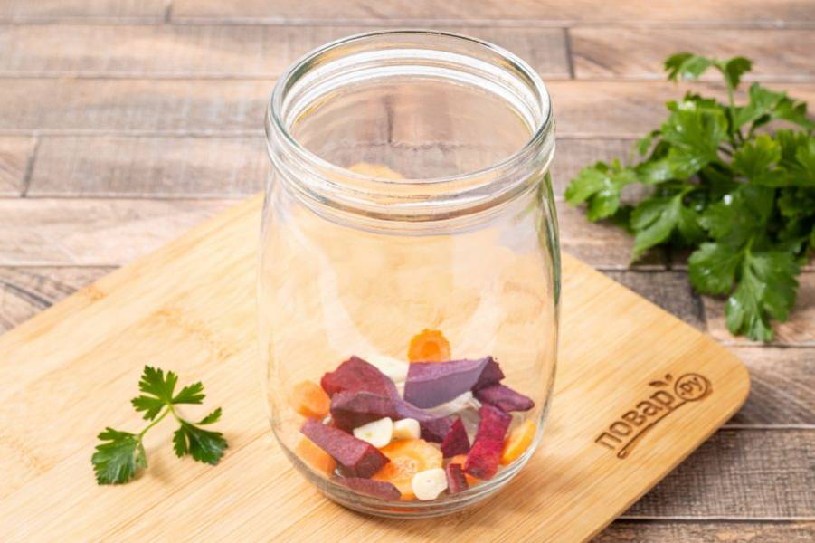 На дно чистой стерилизованной банки выложите немного свеклы, моркови и чеснока.