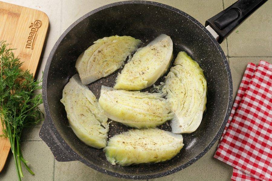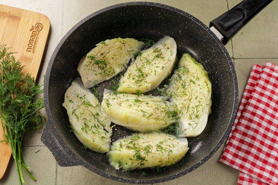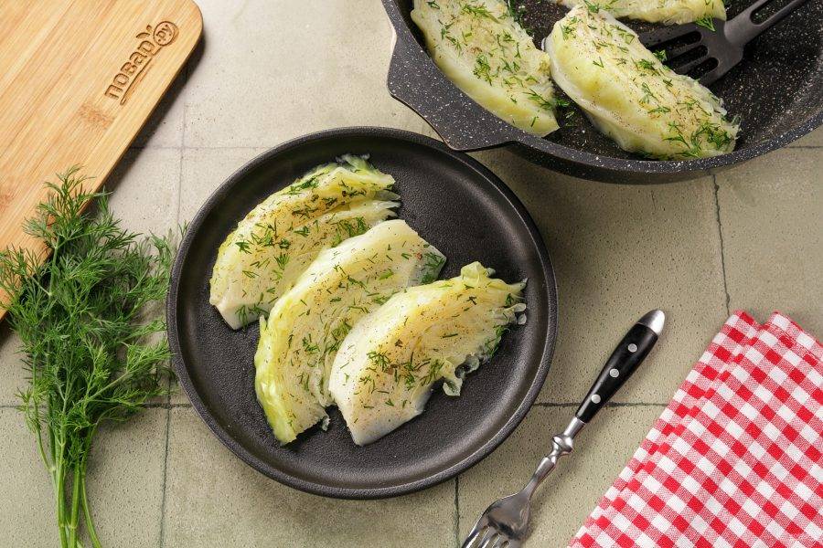 Накройте крышкой и доведите до кипения, затем огонь сделайте минимальный и готовьте около 10 минут или до желаемой степени мягкости капусты. В конце капусту посолите и приправьте молотым перцем.