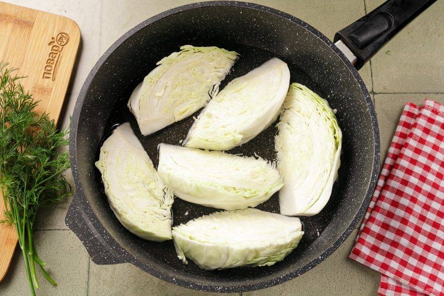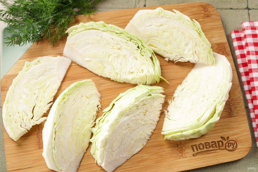 Если у вас целый качан, сначала разрежьте его вдоль пополам. Не забудьте снять верхние листья. Нарежьте по кочерыжке на дольки. У меня получилось шесть частей толщиной 1,5-2 см.