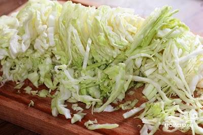 Капусту мелко шинкуем. Посыпаем солью и, если капуста молодая, просто перемешиваем. Если делаем салат осенью - капусту слегка обжать, так она станет помягче.