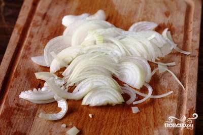 Лук чистим, моем и тонко нарезаем. Чтобы немного "пригасить" остроту лука, я сбрызгиваю его лимонным соком или уксусом.