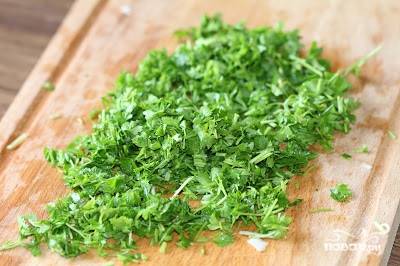 Зелень моем и мелко нарезаем. Я нарезанную зелень слегка приминаю ножом - она пускает сок, становится мягче и ароматнее.