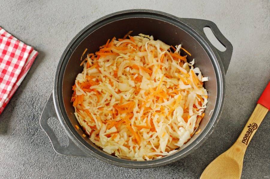 Добавьте тертую морковь и нарезанный перьями или четвертинками лук.