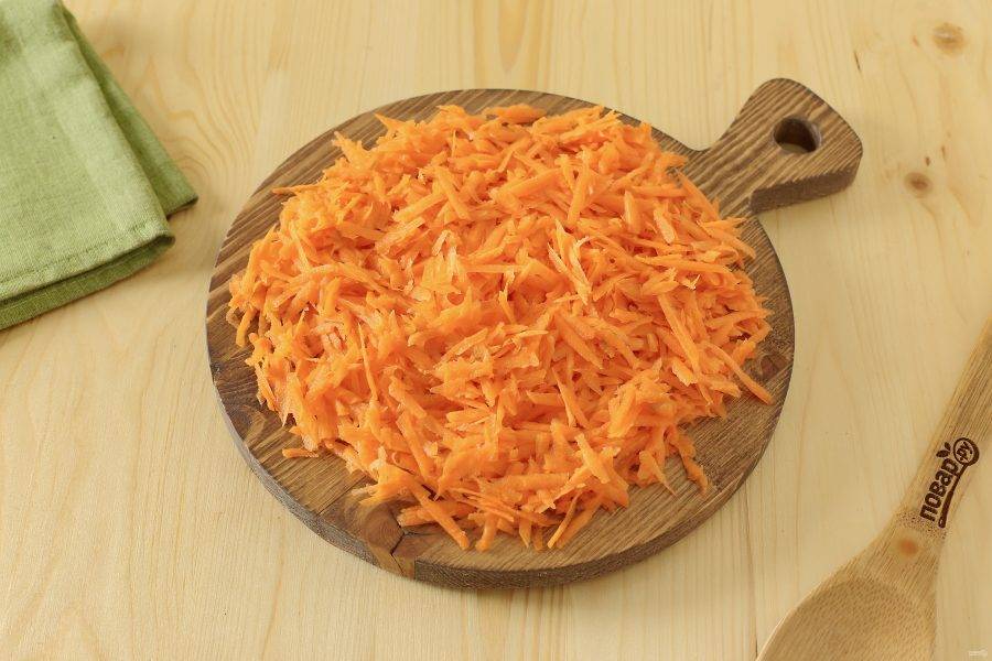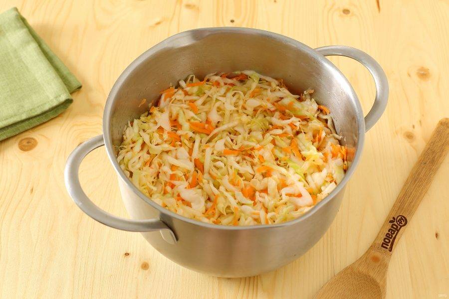 Соедините капусту, морковь, соль и сахар. Помните все руками, чтобы капуста пустила сок.