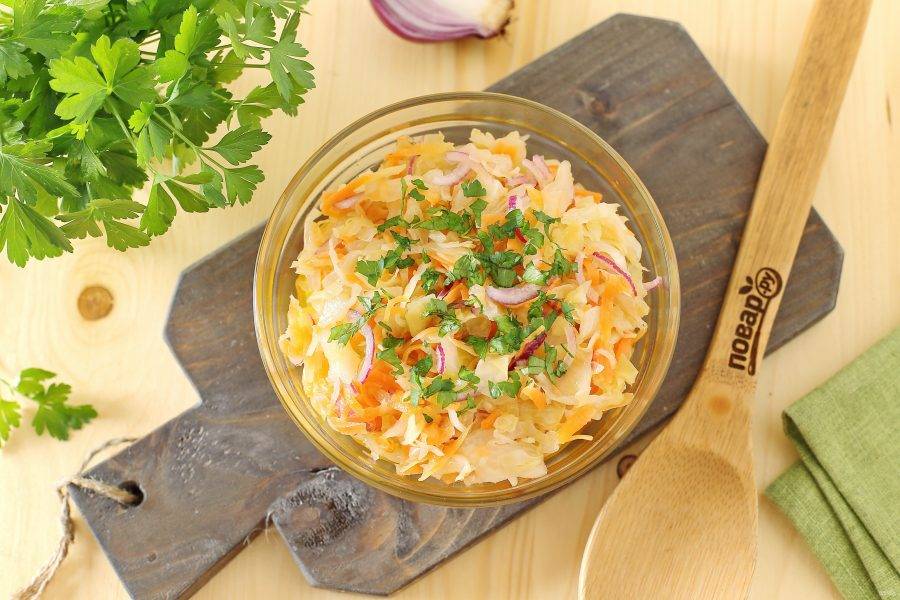 Перед подачей на стол капусту отожмите от сока, переложите в миску, добавьте репчатый лук, пару щепоток сахара, заправьте растительным маслом и перемешайте. Приятного аппетита!