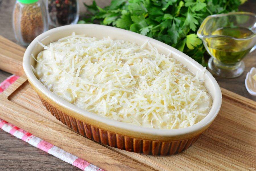 Присыпьте запеканку тертым сыром и поставьте в духовку.