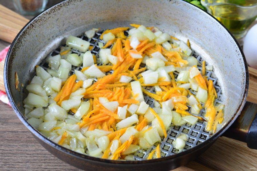 Нарежьте кубиками репчатый лук, морковку натрите на терке. Разогрейте масло в сковороде, выложите овощи и пассеруйте пару минут помешивая.