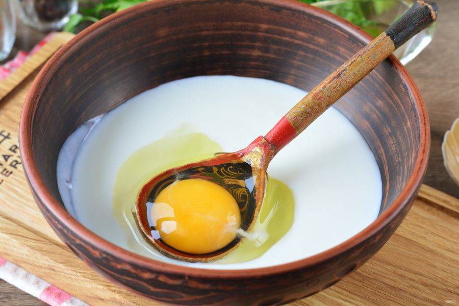 Для теста влейте кефир в миску. Вбейте туда же куриное яйцо. Перемешайте массу.