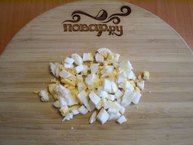 4. Отвариваем одно яйцо, второе оставляем сырым. Вареное яйцо чистим, режем на кубики.
