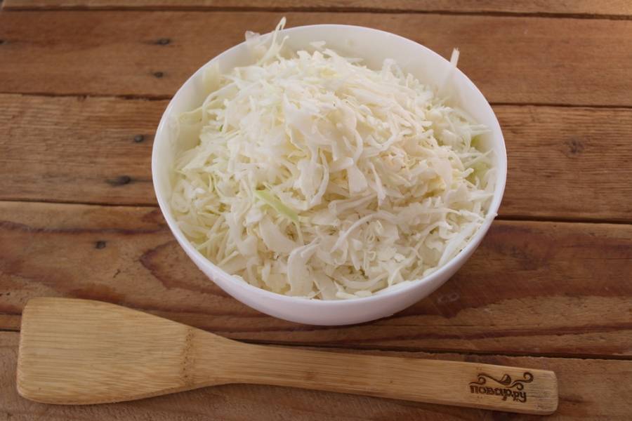 Капусту белокочанную нашинкуйте очень тонко и длинно.