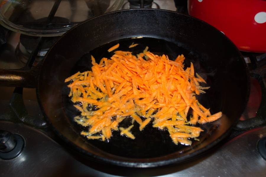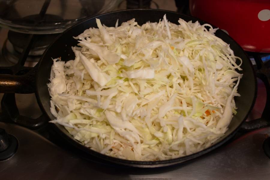 Обжарьте морковь. Потом добавьте капусту. Тушите, помешивая, до мягкости. Посолите, поперчите.