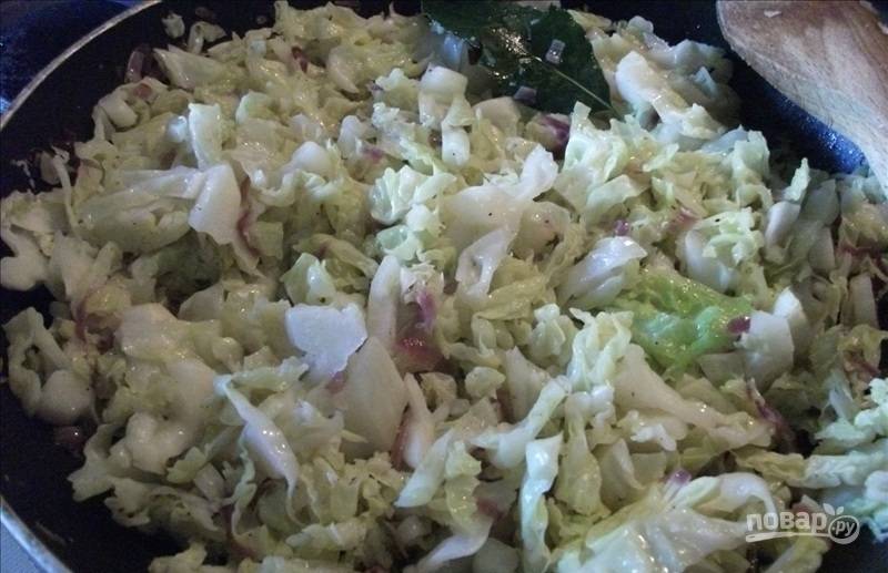 В высокой сковороде обжарьте мелконарезанный репчатый лук и чеснок в оливковом масле. Добавьте нарезанную соломкой капусту, лавровый лист, приправьте солью, черным перцем и готовьте начинку в течение нескольких минут под крышкой, так, чтобы капуста осталась немного хрустящей. Снимите сковороду с огня и дайте начинке остыть.