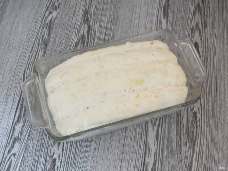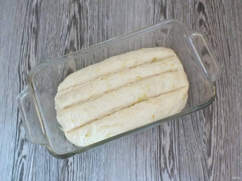 Продолговатую форму смажьте тонким слоем растительного масла. Выложите тесто, на поверхности сделайте надрезы. Прикройте полотенцем и оставьте для подъема на 30 минут.