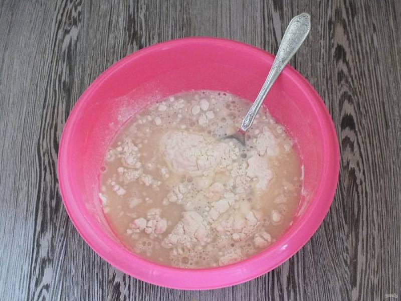 В чаше смешайте муку и дрожжевую смесь. Начните замес ложкой.