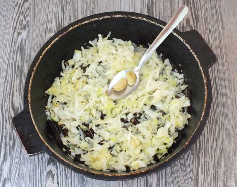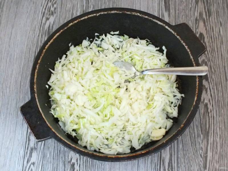 В жаровне разогрейте растительное масло, переложите в неё капусту и чеснок. Обжаривайте на малом огне, не допуская изменения цвета.