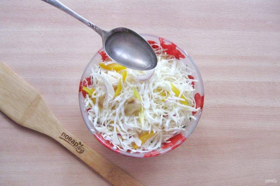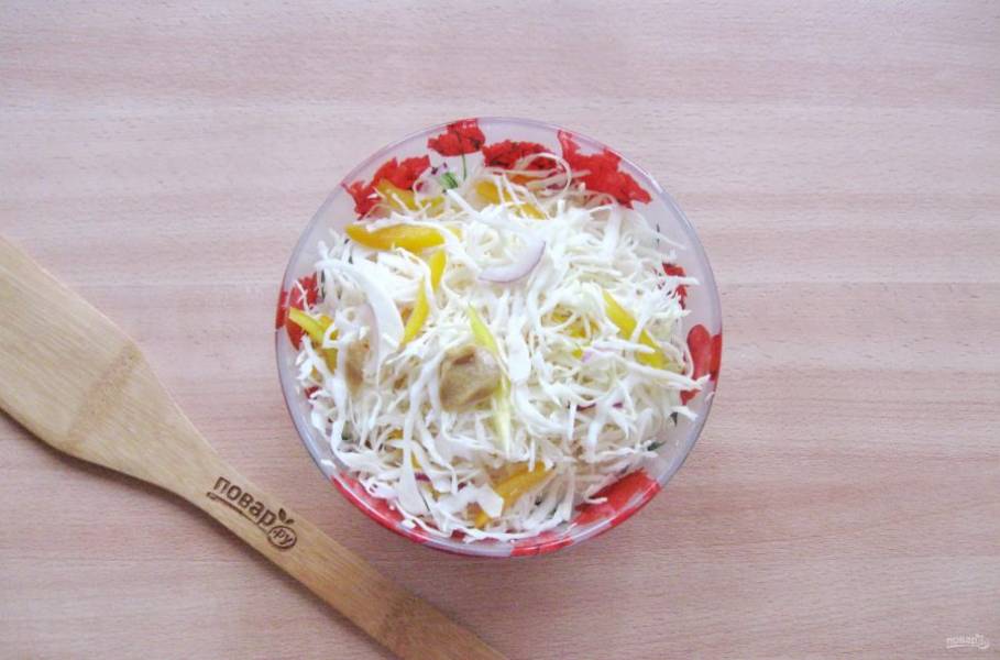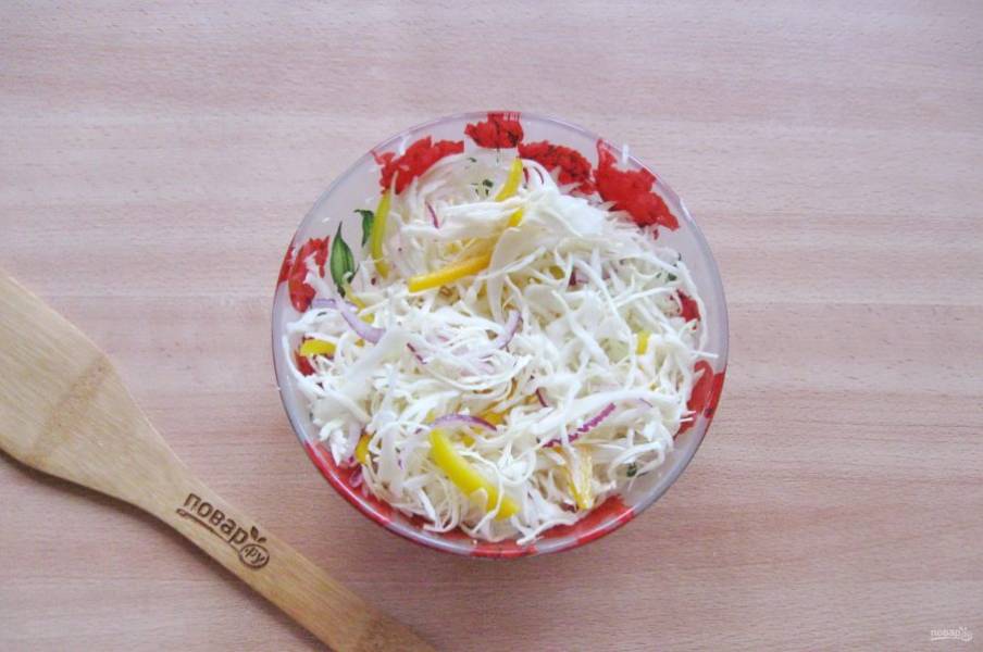 Перемешайте капусту, лук и перец. Помните немного руками, чтобы овощи пустили сок.