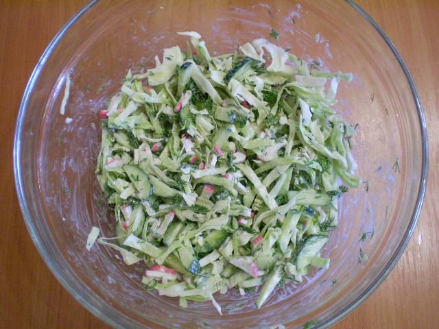 Попробуйте приготовить капустный салат с добавлением крабовых палочек и свежего огурца.