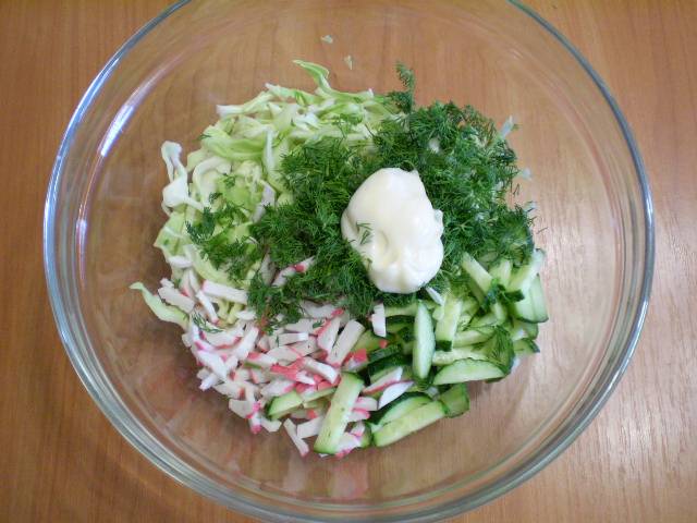 3. Сложите продукты в салатник. Добавьте соль и укроп. Заправьте майонезом.